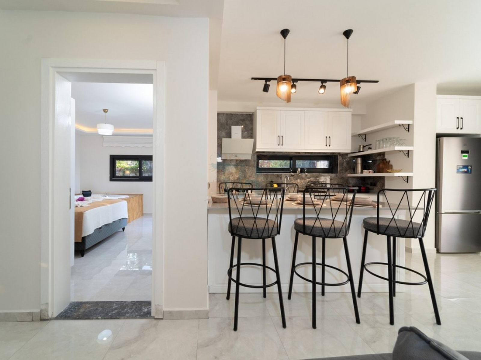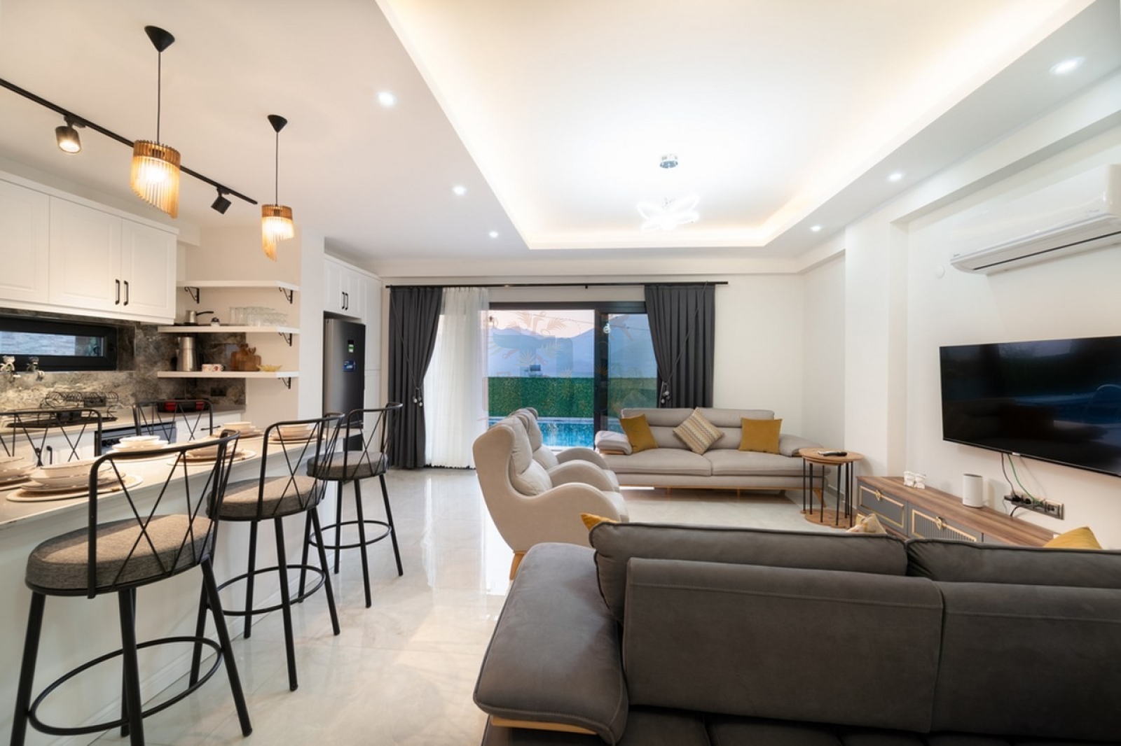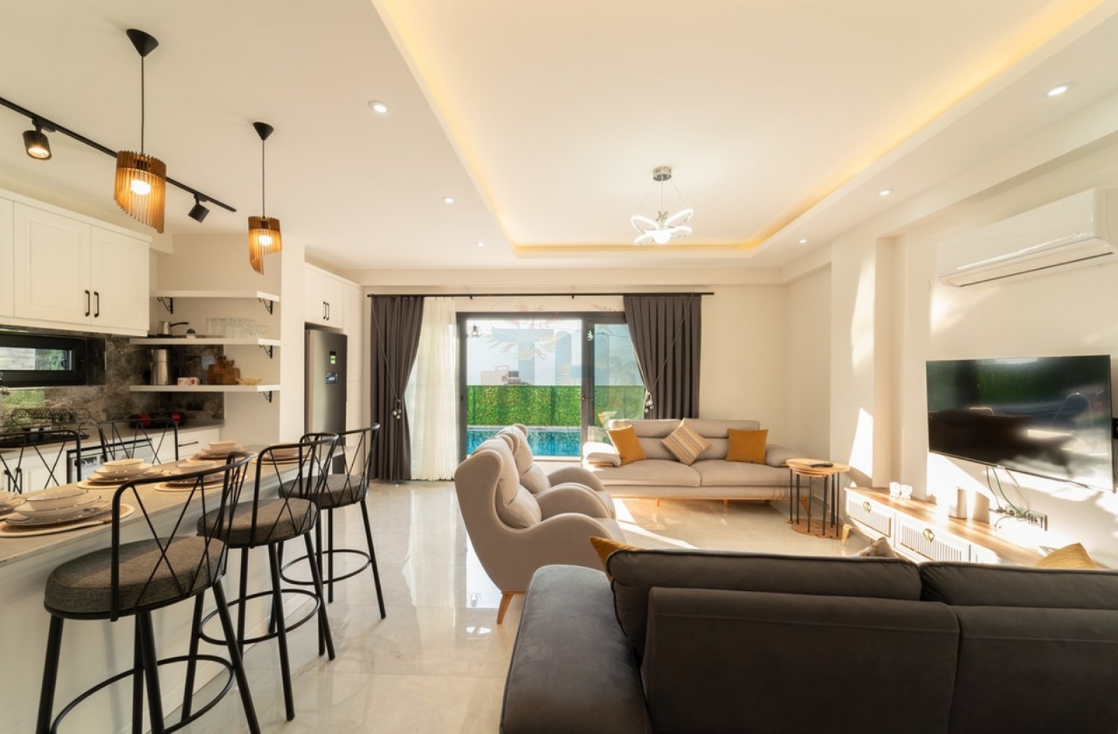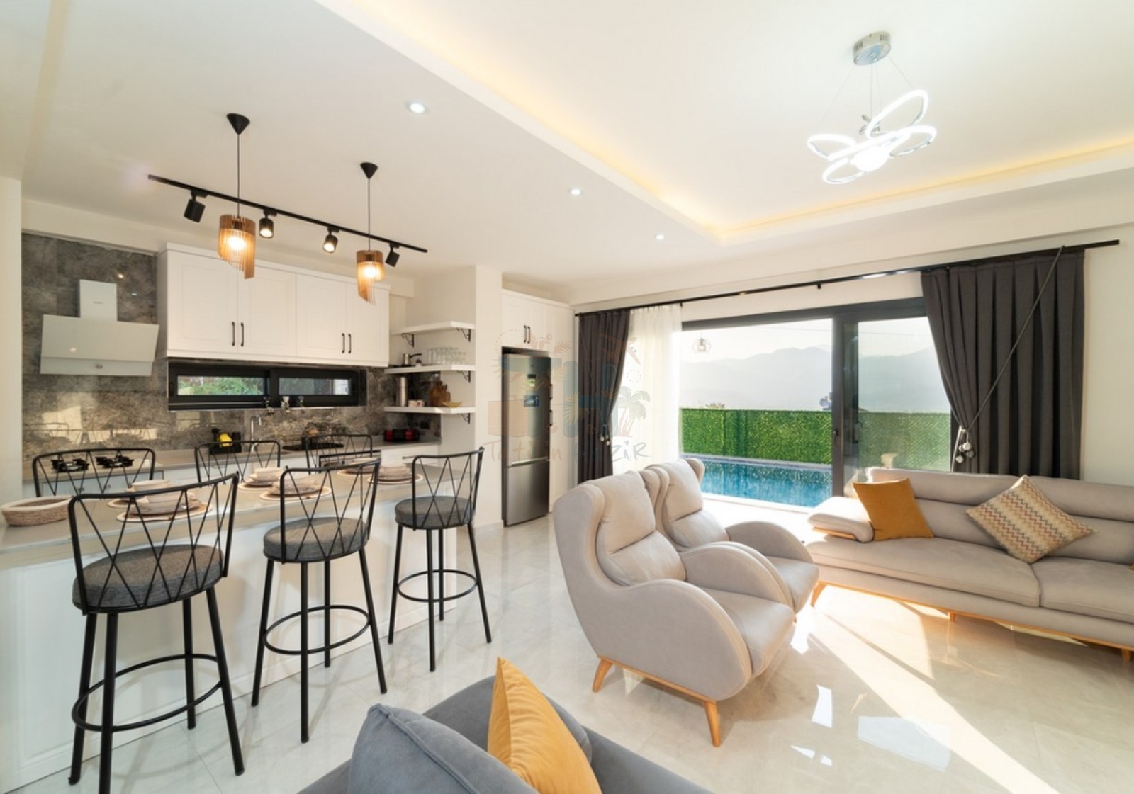 Modern Tasarım: Zarif iç dekorasyon, modern mobilyalar ve kaliteli malzemelerle tasarlanmış geniş bir yaşam alanı.