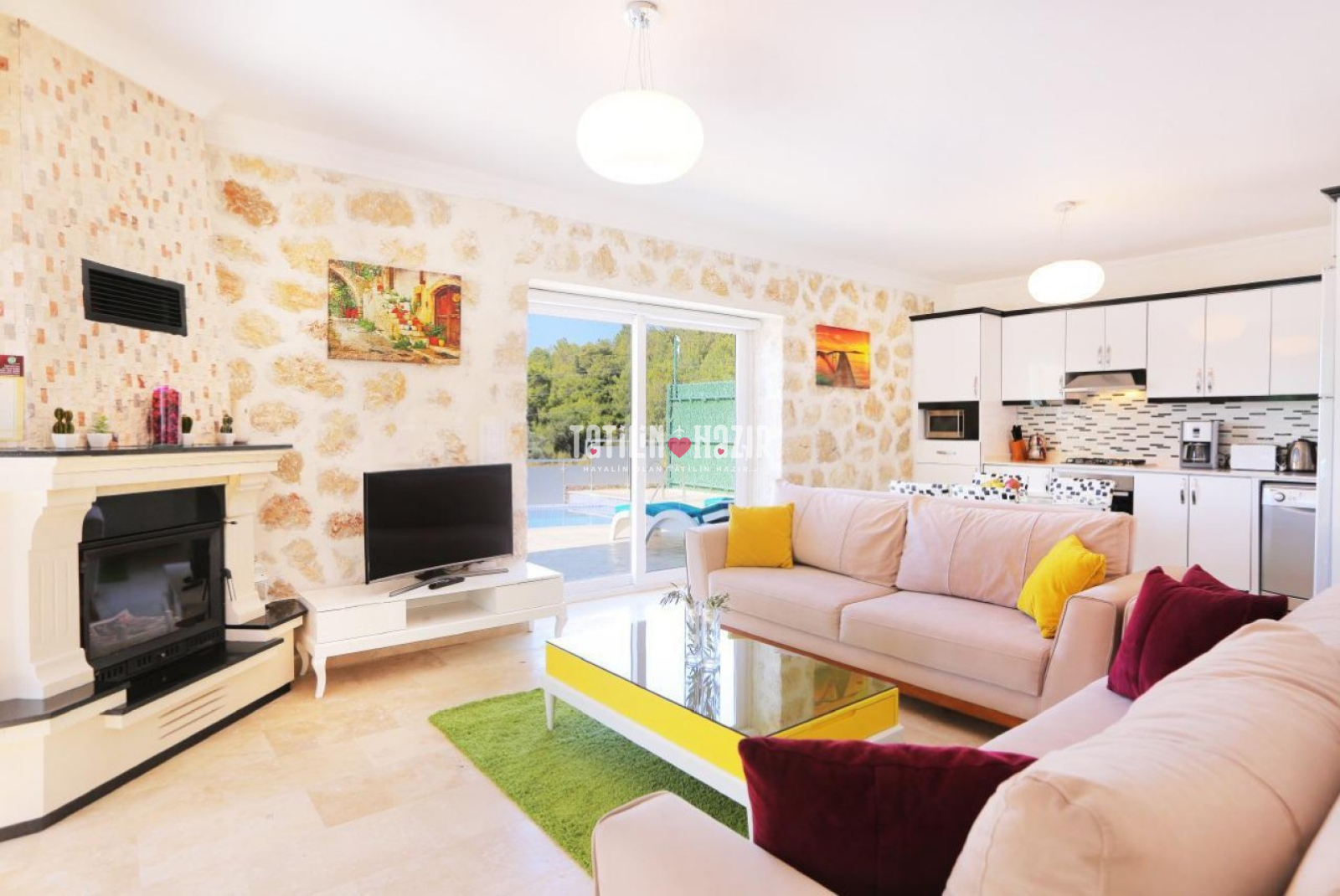 Salon : Villa Alya’nın klimalı salonu muhteşem bir doğa manzarasına sahiptir. Salonda modern ve rahat oturma grubu, 4 kişilik yemek masası ve sandalyeleri, TV, DVD, uydu alıcısı ve modem bulunmaktadır. Salondan havuz kenarına çıkış vardır. Havuz katındadır.
