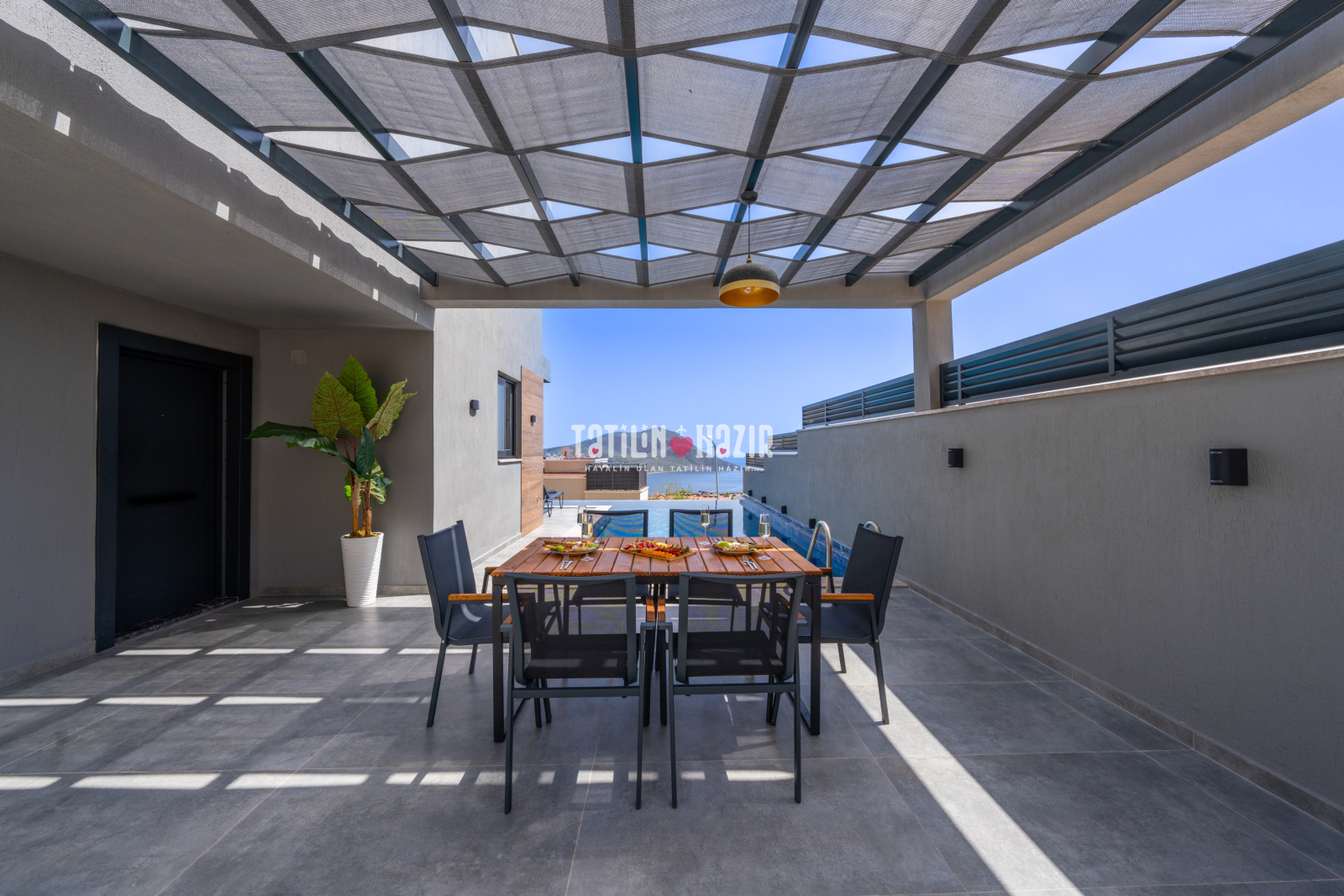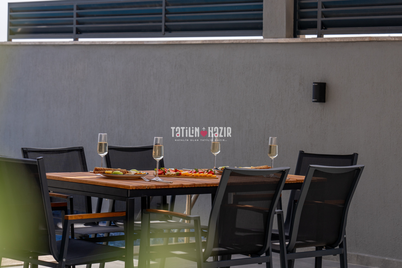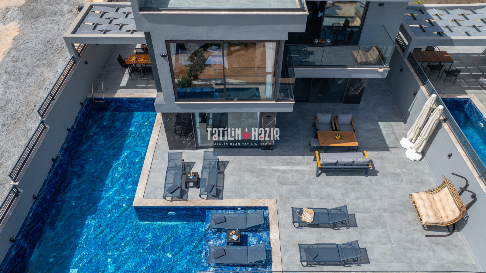 Havuz Terasında; özel yüzme havuzu, şezlong, salıncak, şemsiye, bahçe oturma grubu, yemek masası, bulunmaktadır.