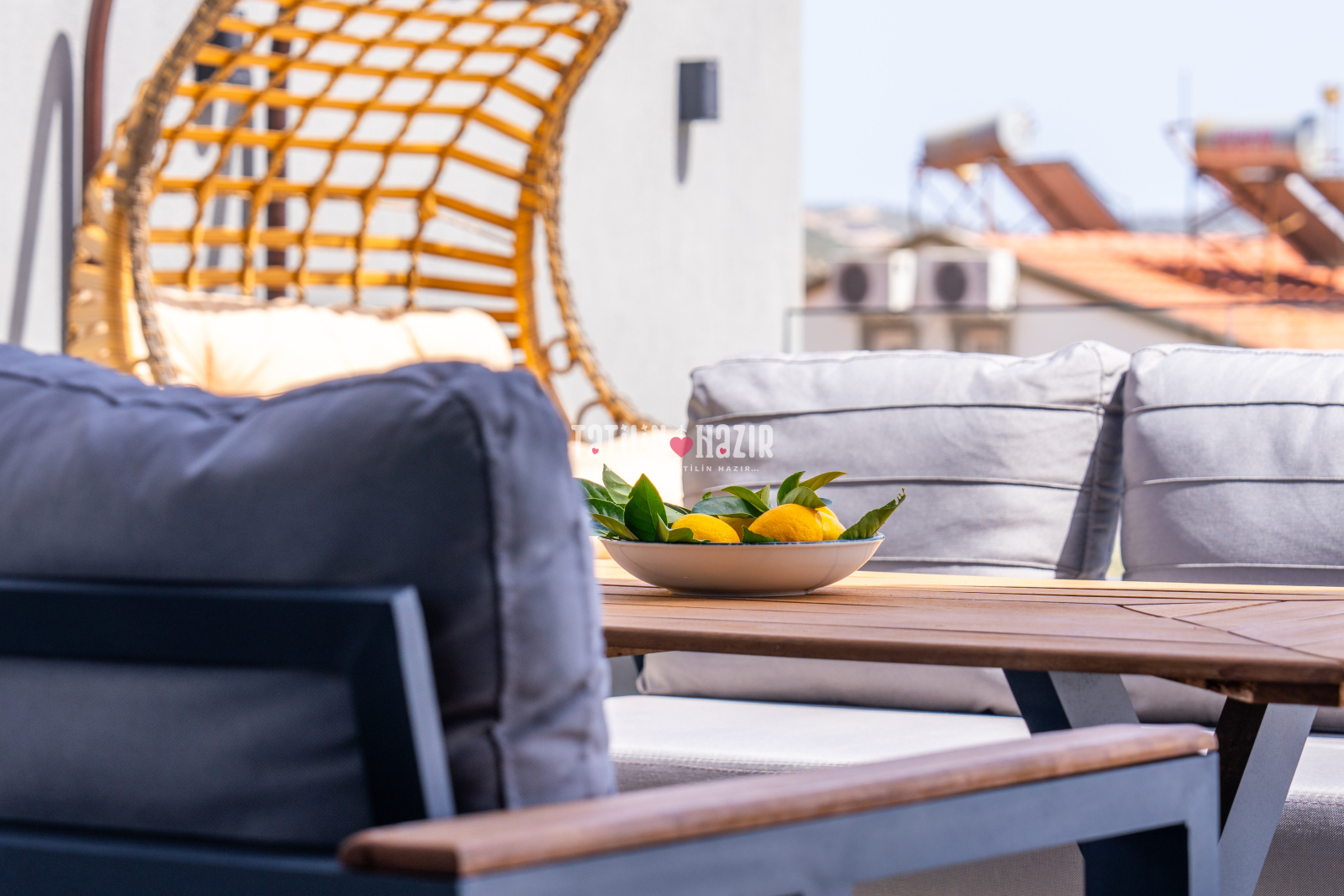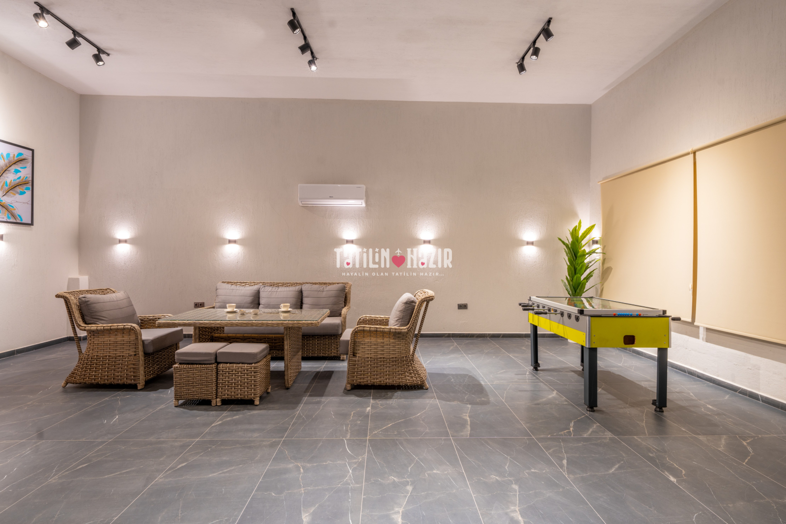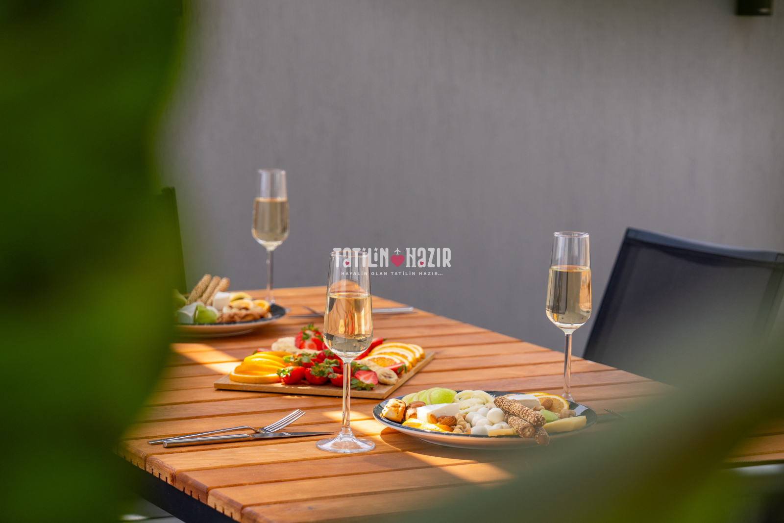 Havuz Terasında; özel yüzme havuzu, şezlong, salıncak, şemsiye, bahçe oturma grubu, yemek masası, bulunmaktadır.