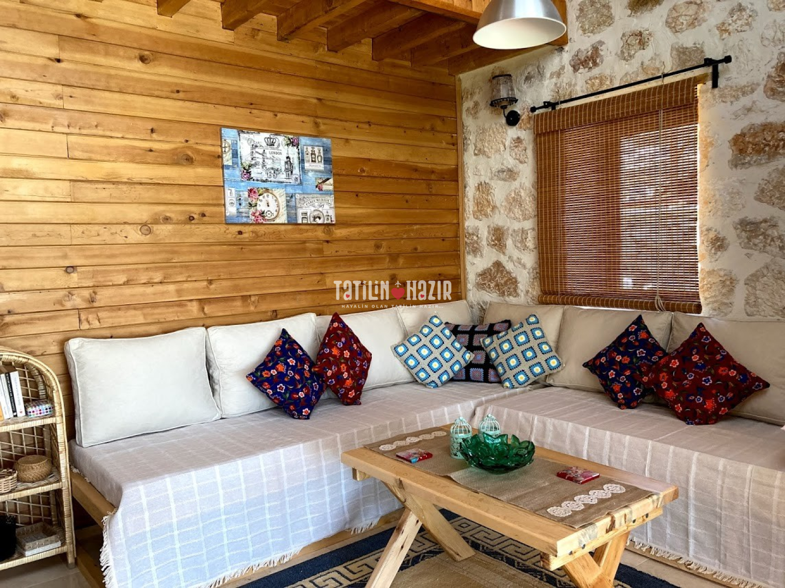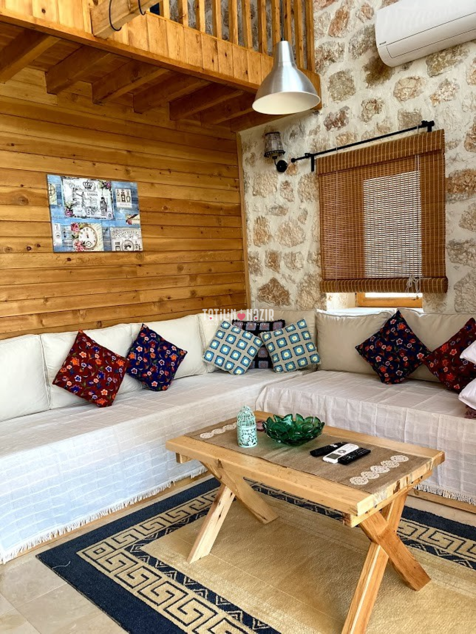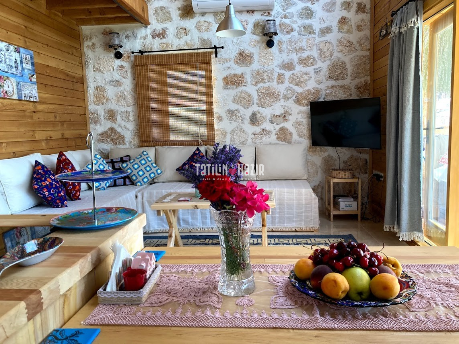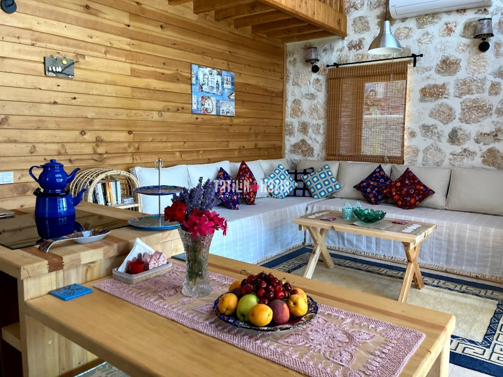 Fıstık Ev'e girdiğiniz anda sizi yüksek tavanlı, ahşap ve doğal taş dokunun sarmaladığı sıcak bir ortam bekliyor. Geniş cam yüzeylerden sizi kucaklayan Kaputaş Vadisi ve Akdeniz'in sonsuz ufku aydınlık ve ferah bir mekanın parçası olarak karşınıza çıkıyor. Geleneksel sedirli oturma odanızda en sevdiğiniz kitabınızı okuyabilir, televizyon seyredebilir ya da yalnızca yanıbaşınızda sizi saran huzur dolu doğanın keyfini çıkarabilirsiniz.