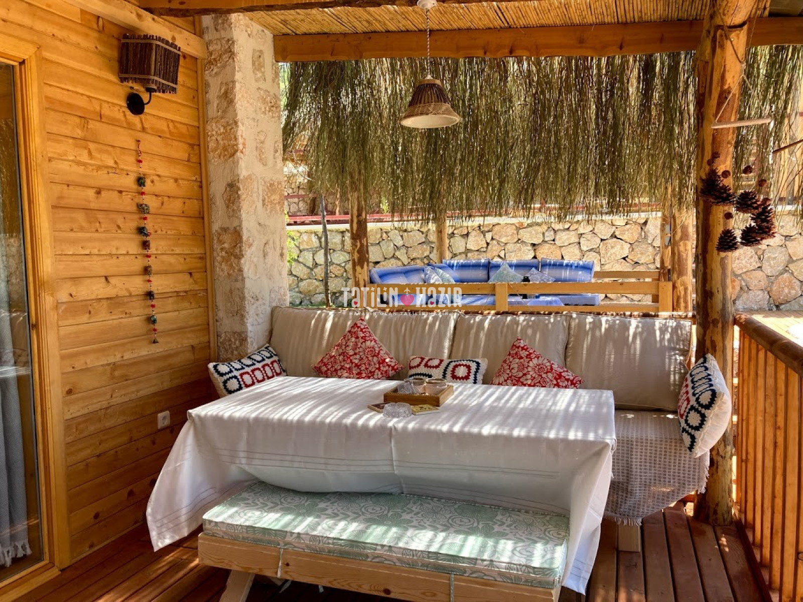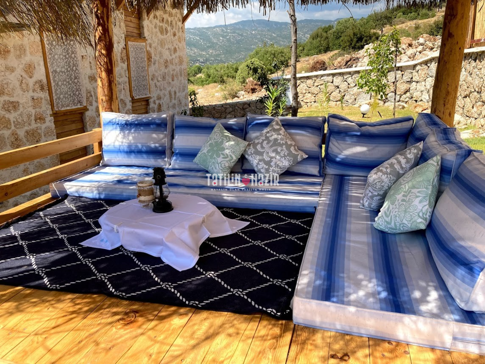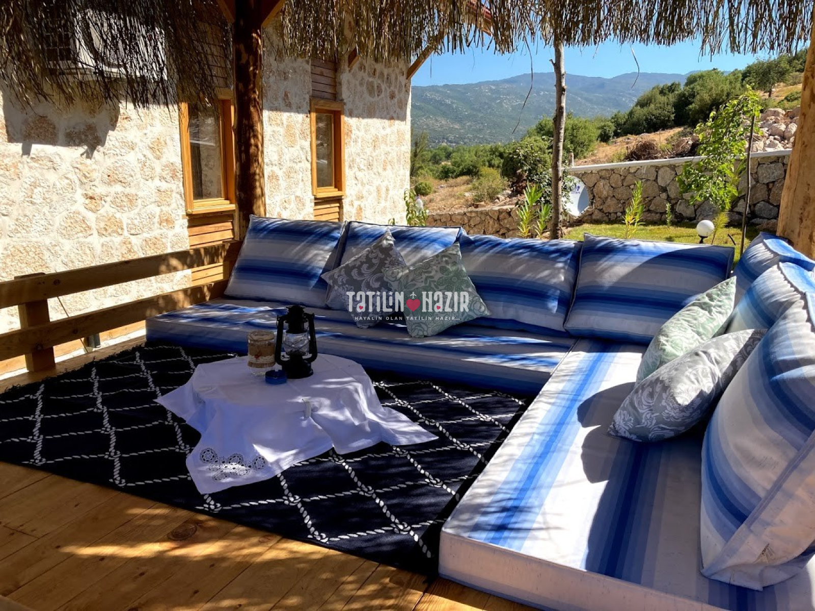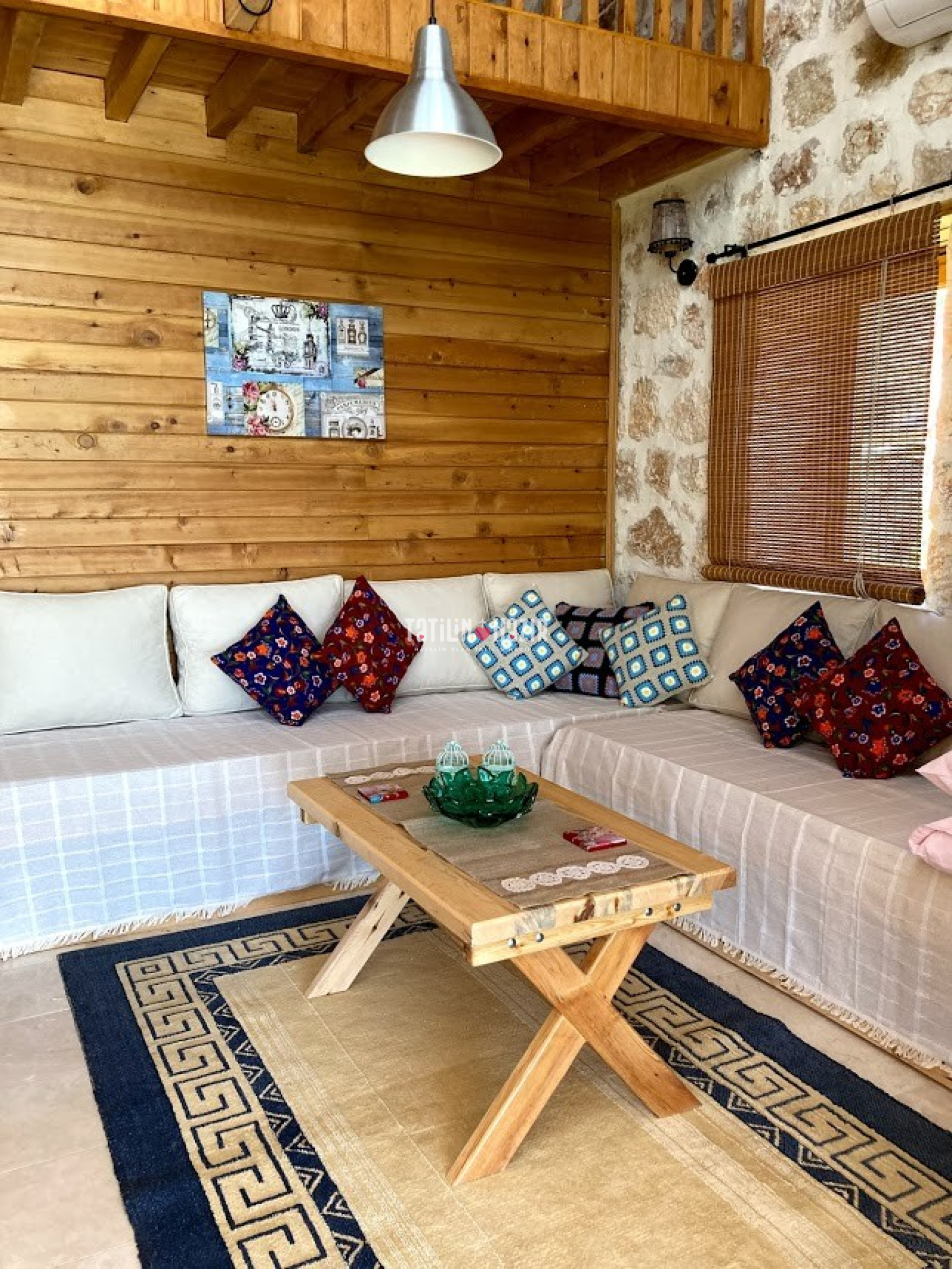 Fıstık Ev'e girdiğiniz anda sizi yüksek tavanlı, ahşap ve doğal taş dokunun sarmaladığı sıcak bir ortam bekliyor. Geniş cam yüzeylerden sizi kucaklayan Kaputaş Vadisi ve Akdeniz'in sonsuz ufku aydınlık ve ferah bir mekanın parçası olarak karşınıza çıkıyor. Geleneksel sedirli oturma odanızda en sevdiğiniz kitabınızı okuyabilir, televizyon seyredebilir ya da yalnızca yanıbaşınızda sizi saran huzur dolu doğanın keyfini çıkarabilirsiniz.