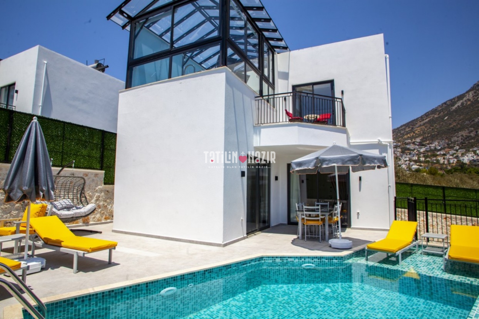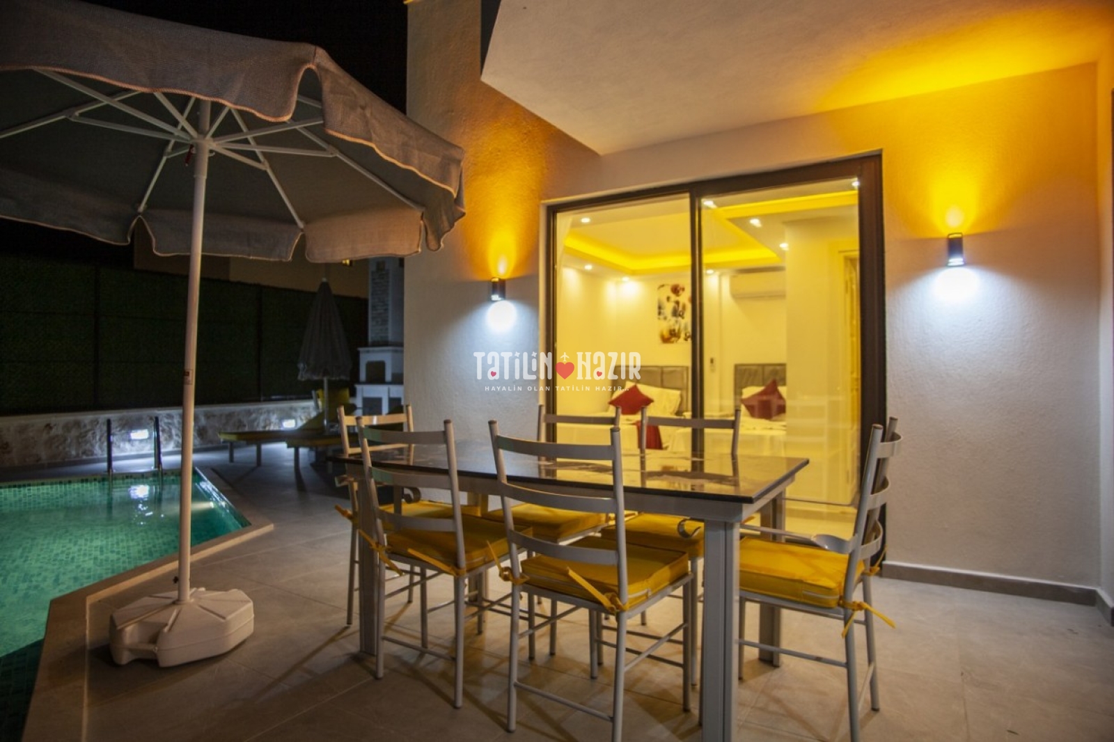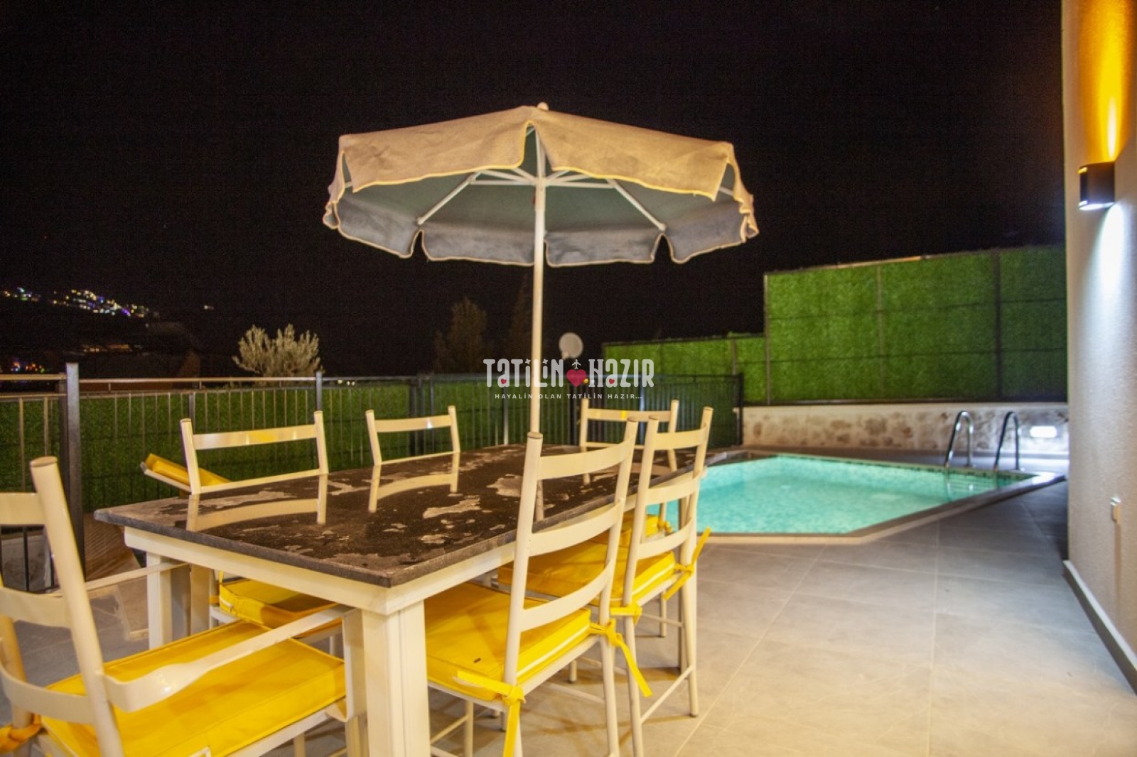 Kalkan' ın doğal güzellikleri arasında yer alan bu 2 yatak odalı villa, 4 kişilik konaklama kapasitesiyle hem rahat hem de lüks bir tatil fırsatı sunuyor. Özel yüzme havuzunuzda güneşin tadını çıkarabilir, günün yorgunluğunu atabilirsiniz. Villa, tam donanımlı bir mutfak, geniş bir oturma alanı ve modern dekorasyonuyla sizi bekliyor. Doğayla iç içe, sakin bir atmosferde dinlenmek ve Kalkan ın huzur veren doğasında yenilenmek isteyenler için ideal bir seçim!
