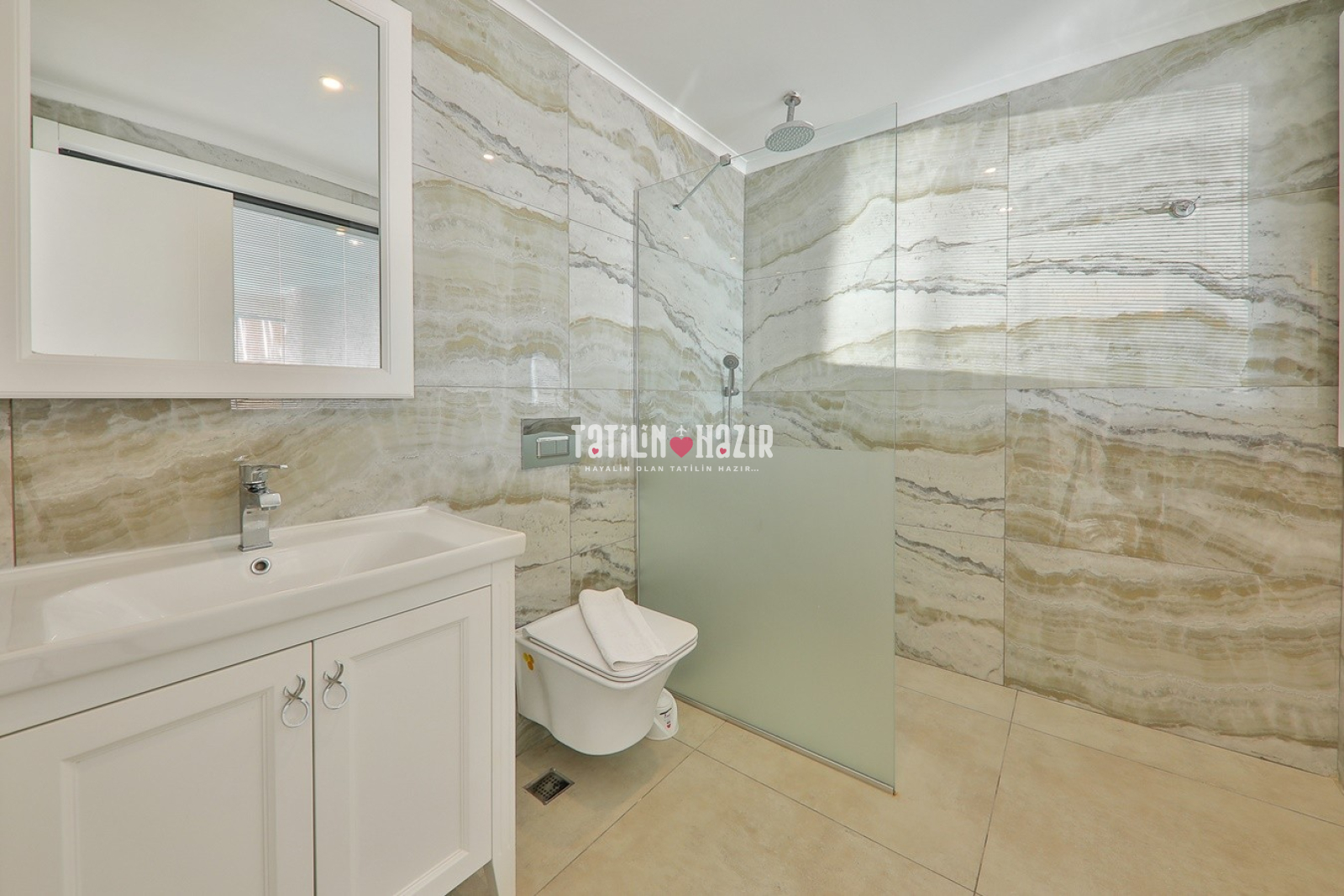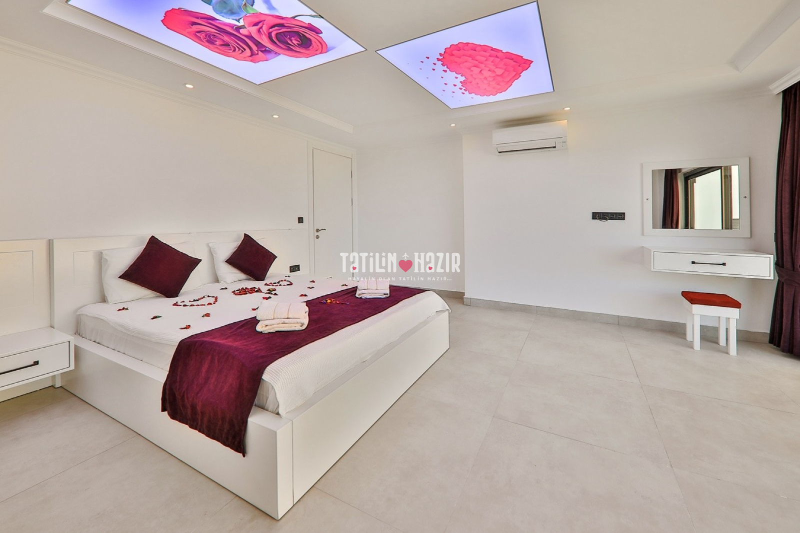 1.Yatak Odası: 1adet çift kişilik yatak, klima, komodin, elbise dolabı, makyaj masası, jakuzi, banyo, wc