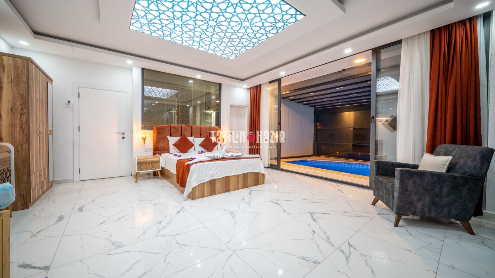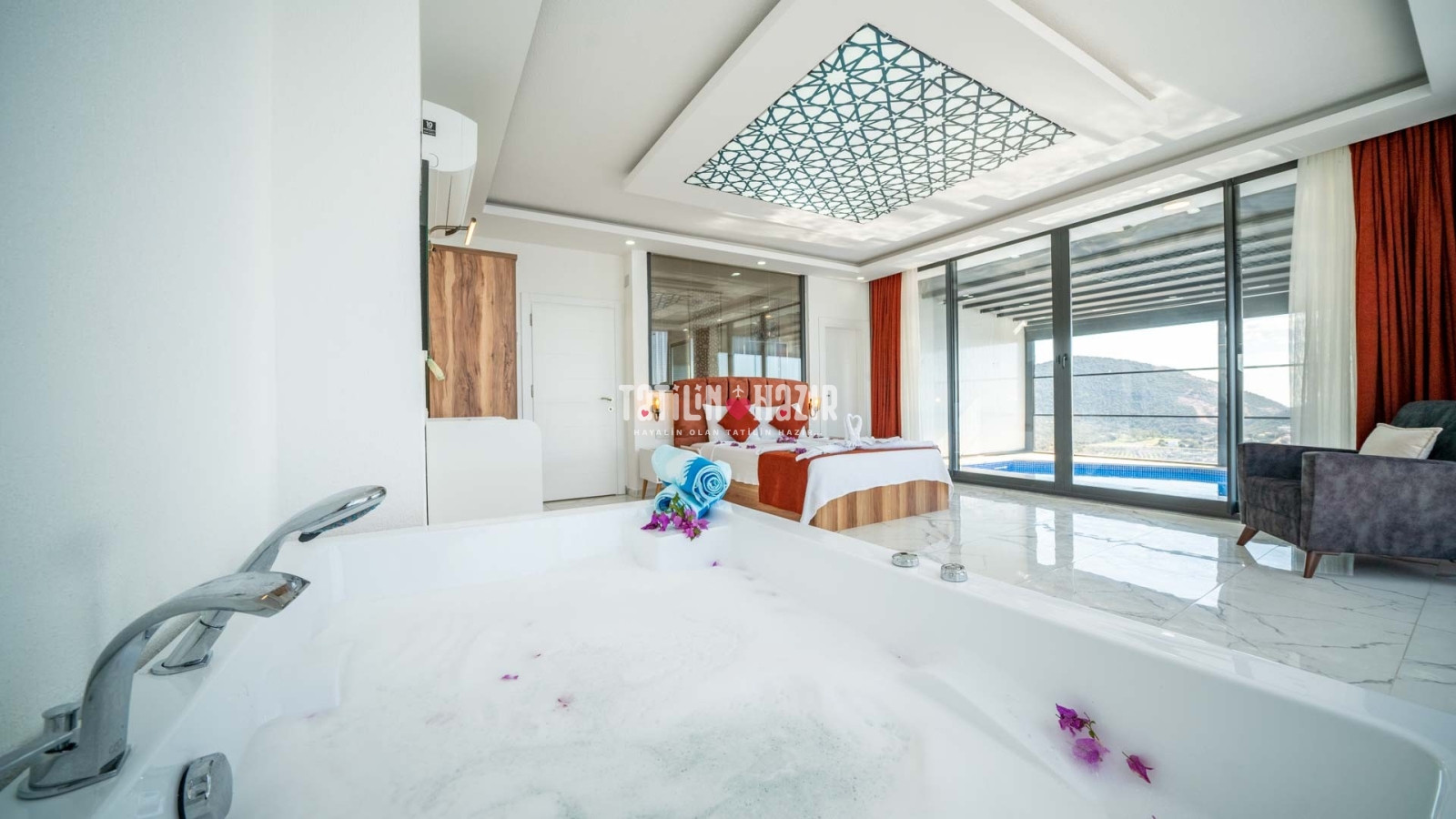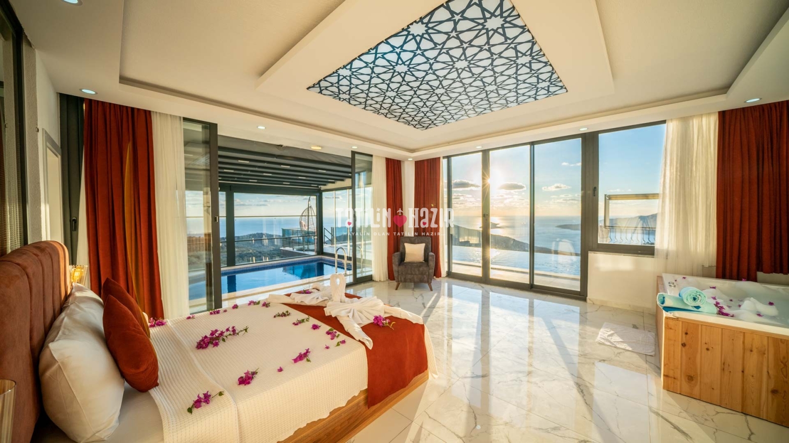 2 adet geniş ve konforlu yatak odası , Lüks jakuzili ana yatak odası , Özel, korunaklı yüzme havuzu , kapalı ısıtmalı havuzu , : Özel bahçe, barbekü alanı, geniş teras