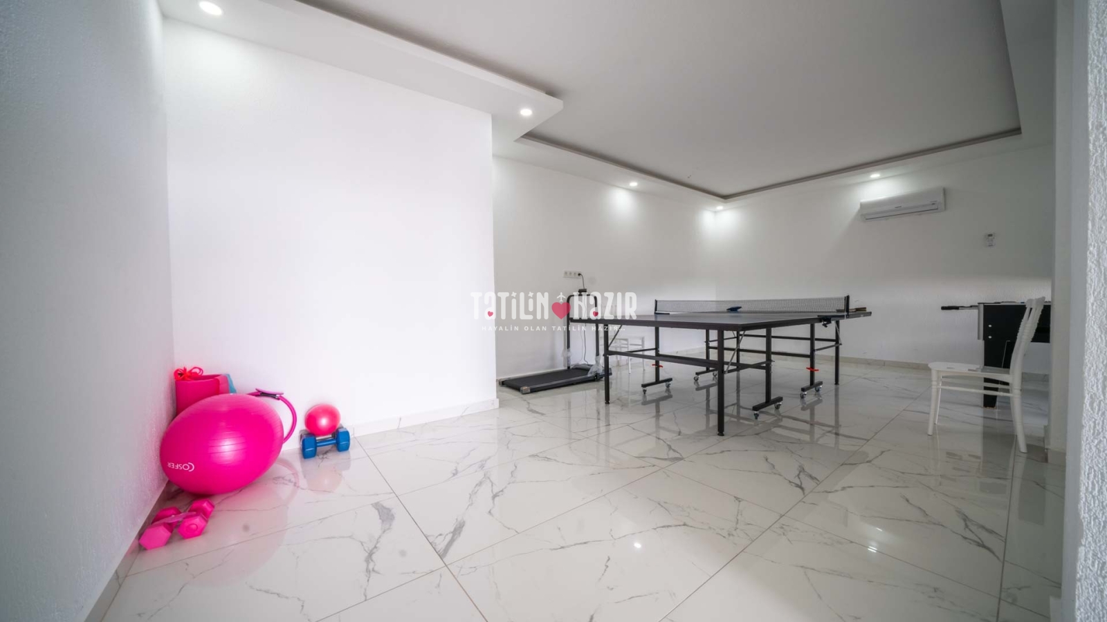 Villamızda yer alan spor odası alt katta yer almaktadır. Havuz terasındaki merdivenden aşağı inerek giriş yapılmaktadır. Bu kısımda bahçe de bulunmakta olup çocuk oyun parkımız da mevcuttur. Villamızın alt katında VillaSpring 2 yer almaktadır. Villaların havuzları, bahçeleri ve girişleri birbirinden bağımsızdır.